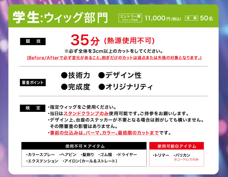 【学生:ウィッグ部門】11,000円(ウィッグ代込み)