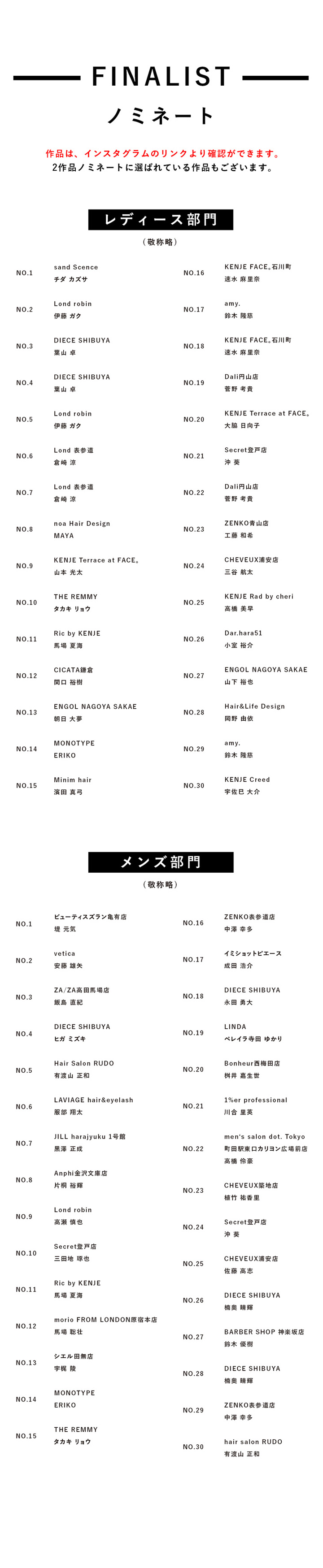 審査員による厳選なる審査の結果、メンズ、レディース部門より各30作品が